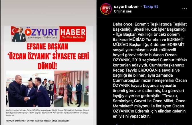 Şirketin sahibi Özcan Özyanık’ın, geçmişte AKP Edremit İlçe Başkan Yardımcılığı yaptığı biliniyor. Aynı zamanda Balıkesir MÜSİAD yönetiminde de bulunan Özyanık, Edremit MÜSİAD Başkanlığı görevinde de bulundu. Özyanık, Edremit Kaymakamlığı’na bağlı Sosyal Yardımlaşma Vakfı Mütevelli Heyeti’nde de yer alırken 2019 seçimlerinde Cumhur ittifakının kontenjan adayıydı.
