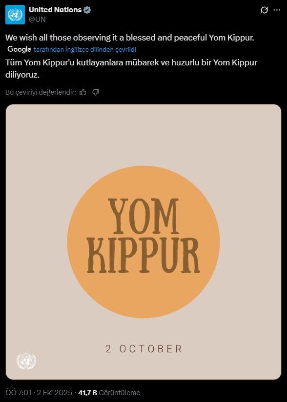 İsrail medyası Sumud filosu saldırısını göz ardı ederken, BM sosyal medya hesabından, Yahudiler için kutsal sayılan Yom Kippur Bayramı’nı kutladı.
