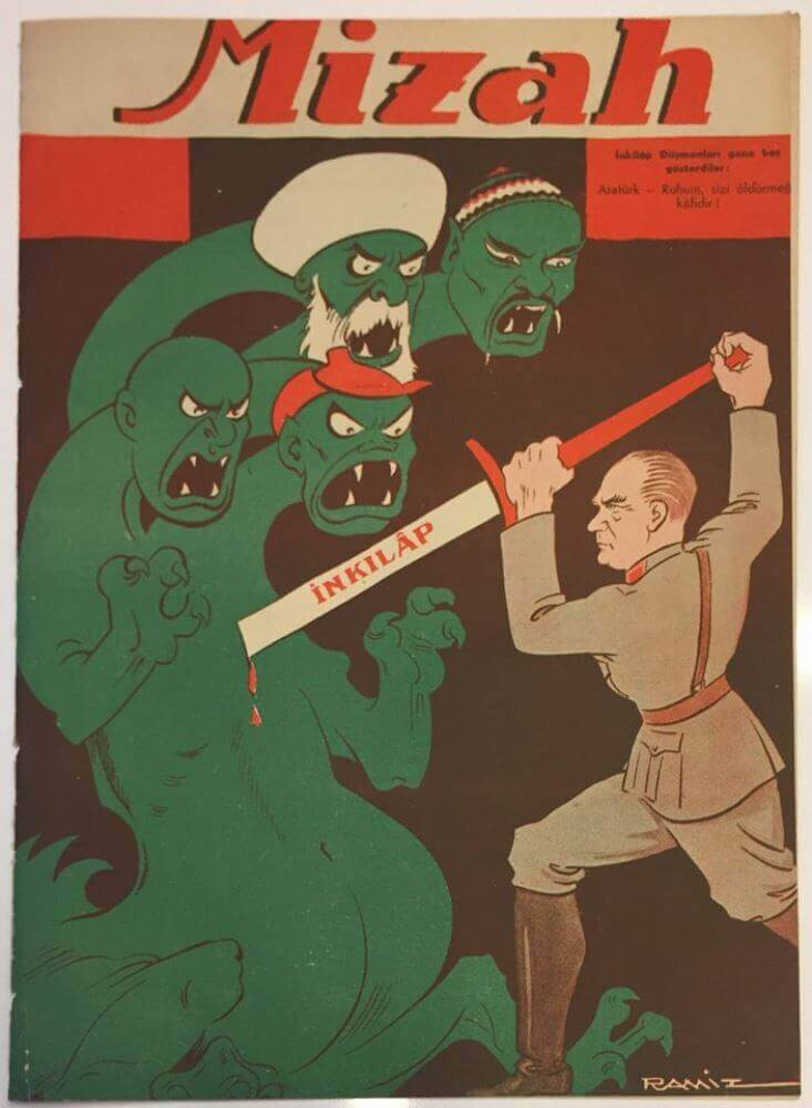 Ramiz Gökçe’nin Mizah Dergisi’nde 13 Haziran 1947 günü yayımlanan karikatüründe Atatürk’ün “inkılâp kılıcı”nı sapladığı canavarın sarıklı, saçsız, kızıl şapkalı ve çekik gözlü başları sırasıyla “İslamcı”, “faşist”, “komünist” ve “ırkçı” gericileri temsil ediyor.