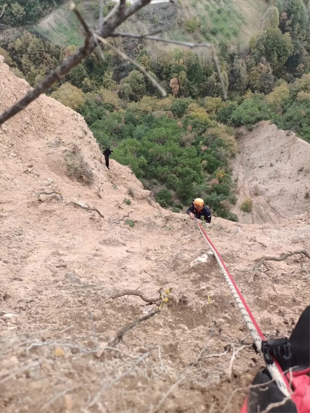 Yaklaşık 15 metre derinlikteki dik yamaca halatlı sistem kuran ekipler, keçinin yanına kontrollü iniş yaptı.