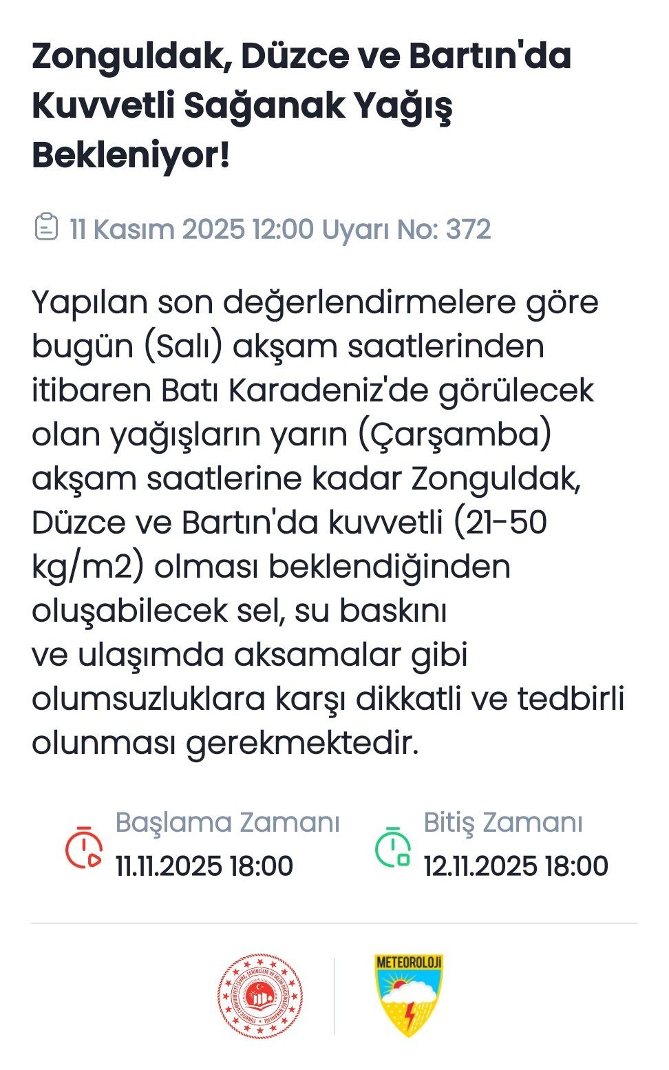 “Yapılan son değerlendirmelere göre bugün (Salı) akşam saatlerinden itibaren Batı Karadeniz’de görülecek olan yağışların yarın (Çarşamba) akşam saatlerine kadar Zonguldak, Düzce ve Bartın’da kuvvetli (21-50 kg/m2) olması beklendiğinden oluşabilecek sel, su baskını ve ulaşımda aksamalar gibi olumsuzluklara karşı dikkatli ve tedbirli olunması gerekmektedir.”